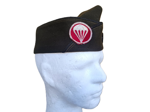 Béret parachutiste 3 parties avec insigne Mourgeon période Indochine, dont le montage d'origine ne laisse aucun doute au vu de la trace laissée sur le drap.